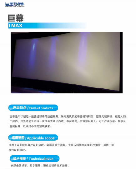 巨幕为超大型电影银幕,其宽度往往大于20米,由于其超出一般影厅尺寸,对银幕也有一些特殊的要求,巨幕具有更大的有效散射角,材料具有更高的强度,其光学指标也更加优异。巨幕又称巨幅银幕,采用双机数字电影放映设备、超宽视角银幕,它的感光面积是普通胶片的10倍,能容纳更多的信息,让观众感受到更丰富的视觉冲击力。巨幕画面的稳定性大大超过常规标准。4K激光巨幕影厅采用4K激光放映技术+高品质激光光源,呈现出接近自然光、更加绚丽、更身临其境的3D放映效果,像水晶玻璃般清晰亮丽。